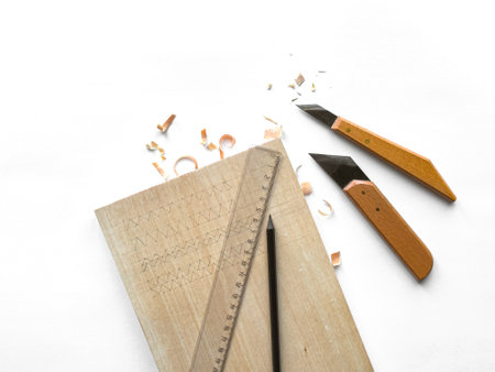 Woodworking tools and block with pencil, ruler, and carving knives on white background