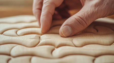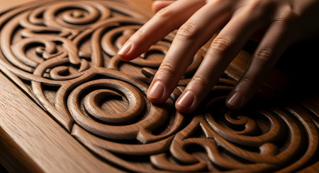 A close-up of a hand gently touching the surface of an intricate wood carving, feeling the texture of the relief pattern. The warm lighting emphasizes the depth of the swirling design and the craftsmanship of the wooden art. The image conveys an appreciation for traditional skills and tactile experiences.