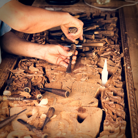 Chiang Mai, Thailand - July 1, 2017: craftsman use a gouge to carve traditional bas-relief on wood at Lanna Expo 2017 in Chiang Mai, Thailand on July 1, 2017.