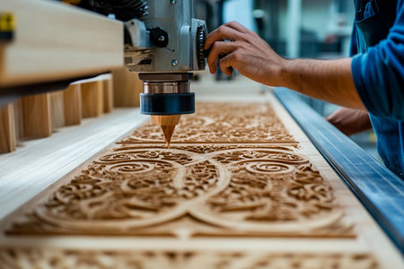 A skilled artisan operates a CNC machine to carve intricate designs into a wooden panel in a bright workshop. The process showcases precision and craftsmanship.