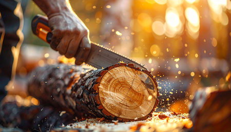 A close-up shot of a man's hand operating a chainsaw, cutting a wooden log. Sawdust and sparks fly in the warm sunlight.