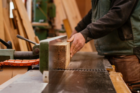 Carpenter cutting wooden plank.