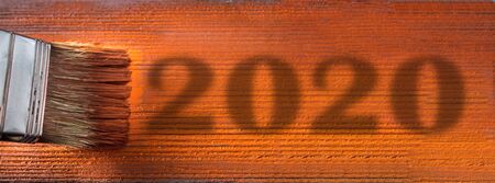 Brush with paint. New year 2020. A man paints blue boards in a brown paint brush. New year concept. shadow 2020.