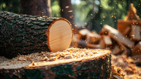 A close-up of a freshly cut tree log with sawdust and wood shavings flying through the air, capturing the action of wood cutting. Perfect for themes of nature, forestry, and craftsmanship.