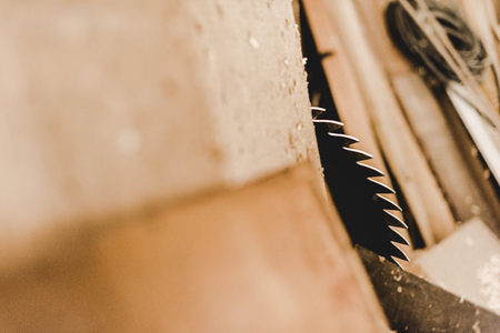 selective focus of round metal saw disc cutting wooden plank
