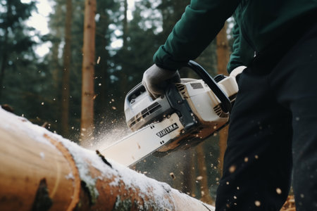 Close up unrecognizable worker woodcutter sawing tool cordless chainsaw motion firewood processing winter working forest. Lumberjack logger cutting tree trunk industry timber outside uniform sawmill