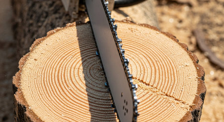 A close-up view of a chainsaw blade poised to cut into a round tree stump. The intricate growth rings of the wood are clearly visible, showcasing the natural patterns and textures. Sunlight casts shadows, highlighting the sharp metal teeth of the chainsaw and the rough surface of the wood. captures a moment of manual labor and the raw of the forest.