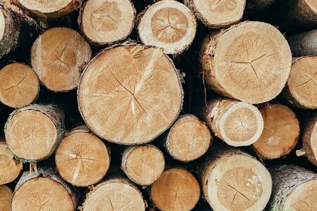 Stack of logs. natural wooden background with timber. log wall. pile of timber