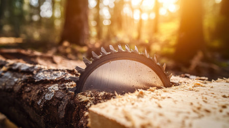 Detailed shot of a timber mill blade finishing a smooth cut on wood, highlighting precision. AI generated.