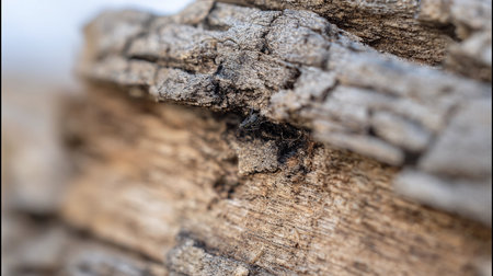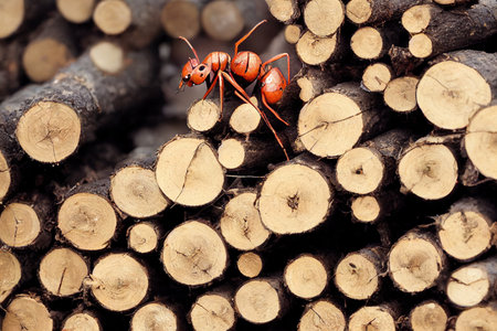 Group of ants on a log in the forest, close-up