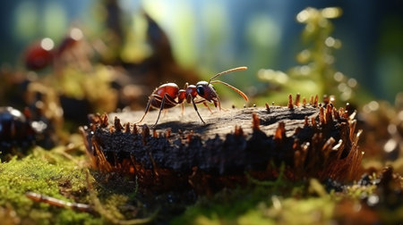 Macro photo of ants crawling on moss in the forest