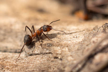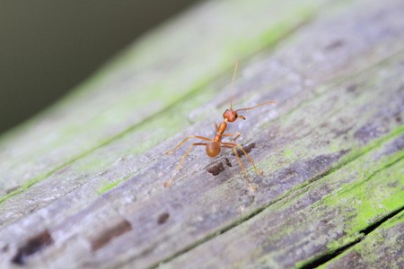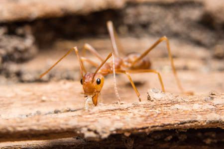 Macro red ants on the wooden floor