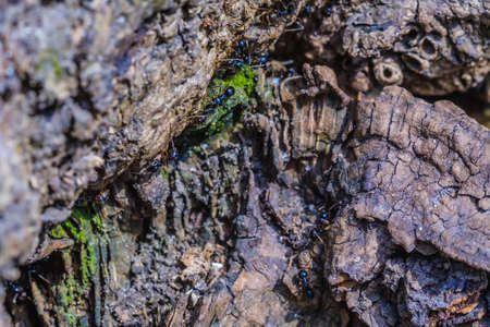 Lots of black ants walking on an old tree trunk in the forest