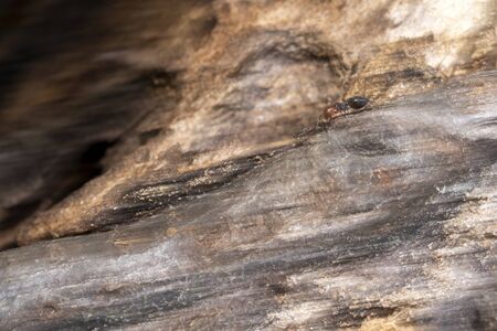 close-up. A black woodworm ant on the surface of a tree.
