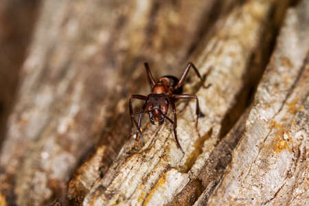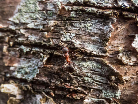 Macro shot of Red wood ant, southern wood or horse ant (Formica rufa) on birch tree bark