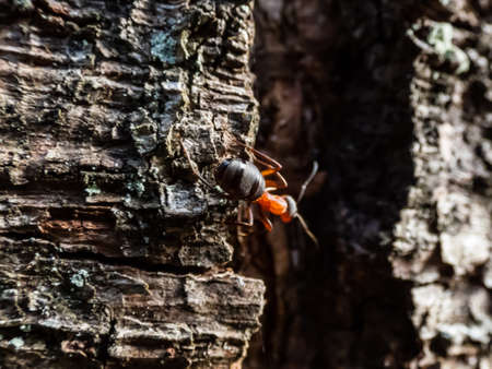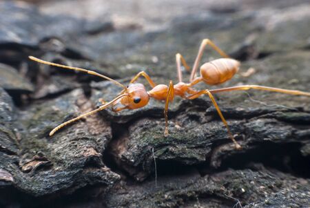 Red fire ants ant insect insects climbing around on tropical tree bark in Patong Beach Kathu District Phuket Island Province Southern Thailand in Southeast Asia.