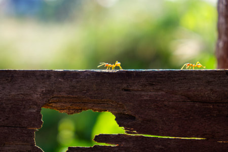 Two small ants walking on weathered wooden againts blurred green background in the garden