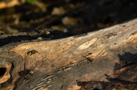 Hardworking ants on log. Insects run on horizontal tree.
