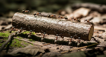 Ants on a log in the forest. Concept of teamwork.
