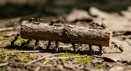 Ants working on a stick in the forest, teamwork concept.
