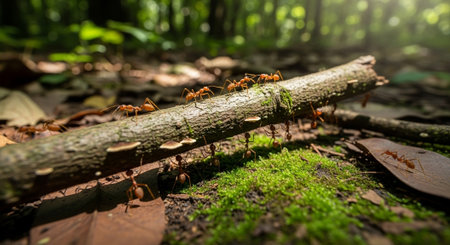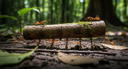 Ants working together in the forest. Ants teamwork concept.
