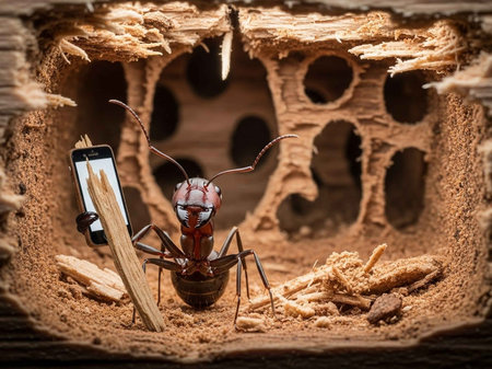 A curious ant stands next to a smartphone in a wooden hole