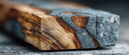 Close up view of a natural wood and stone combination showcasing intricate textures and colors in a subtle and artistic arrangement.