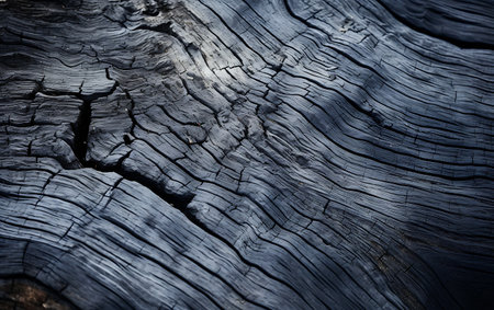 A detailed examination of burned wood reveals unique textures and patterns created through charring and heat exposure.