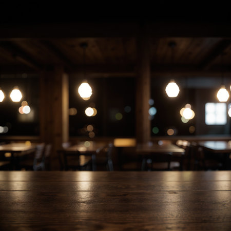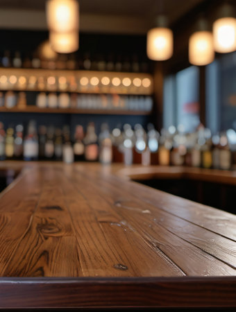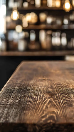 Polished wooden table in cozy ambient bar interior with glowing warm lights and blurred background of shelves and seating.