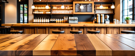 Wooden Countertop in Cafe Bar for Product Presentation Against Blurred Background