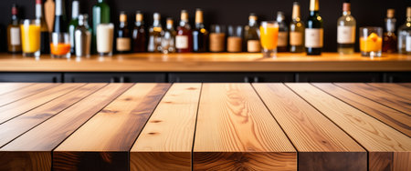 Countertop Made of Wood with Blur Bar Background for Drinks Presentation