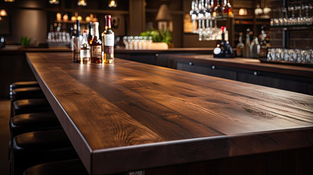 Empty wooden bar counter. Cafe bokeh interior. Generate AI