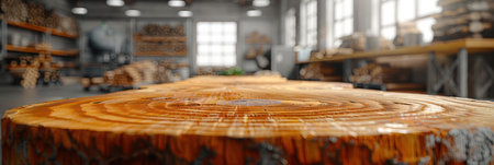 The close up picture of the empty table that has been made from the wood material and placed inside the wood factory, the wood factory is the place for lumber production, wood products manufacturing