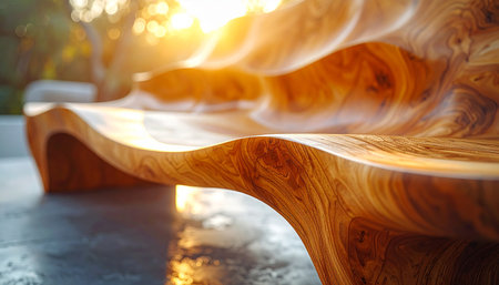 A close-up view of a sculptural wooden bench with a wavy, organic form, showcasing its polished surface and warm sunlight illumination.
