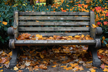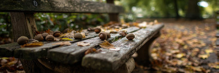 A wooden park bench is surrounded by a carpet of colorful fallen leaves and scattered acorns, capturing the essence of autumns beauty and tranquility.