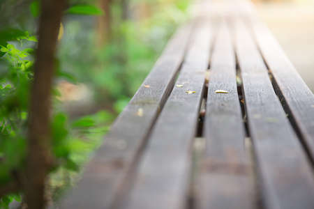 Close up and Selective focus of Wooden bench in the garden with sunlight