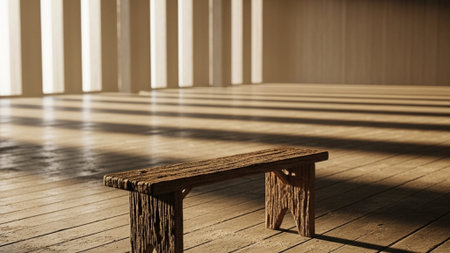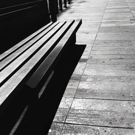 A solitary wooden bench casts a shadow on a sunlit boardwalk, highlighting the grain of the wood and the texture of the weathered planks in bright daylight.