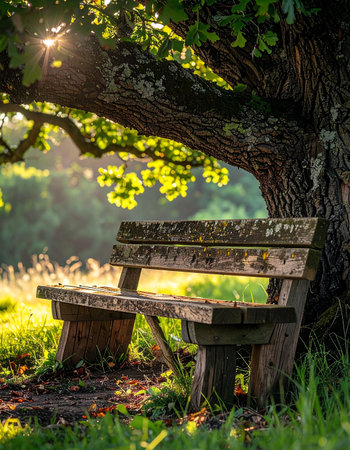 An empty wooden bench rests peacefully under the sprawling branches of an old oak tree.