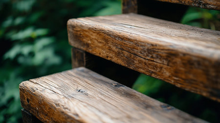 Close-up of two weathered wooden steps, showcasing rustic texture and grain. Lush green foliage creates a soft, blurred background, enhancing the natural, serene atmosphere.