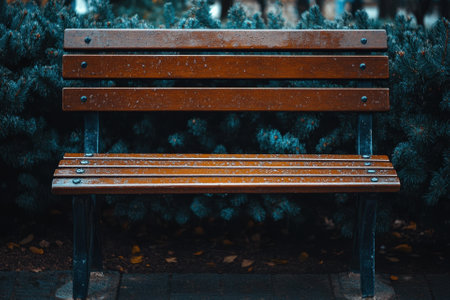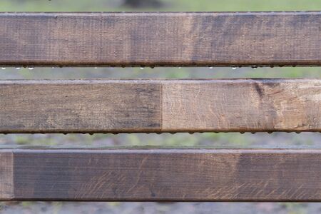 Wet bench in the park in the rain. rainy weather. Wooden chair in the rain. Wet urban furniture. Raindrops on wooden bench. park autumn concept