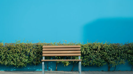 A wooden bench with a metal frame sits in front of a bright blue wall with green bushes growing along the bottom. The bench is empty, and there is a long shadow stretching across the wall behind it.