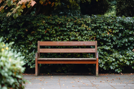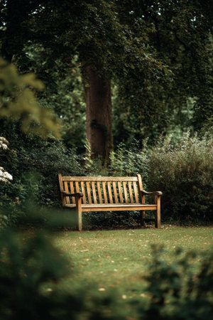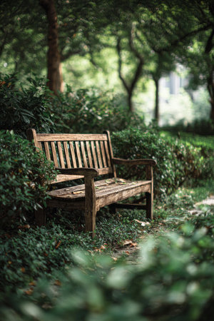 A rustic wooden bench sits quietly in a park surrounded by vibrant green shrubs. The serene setting invites relaxation and reflection.