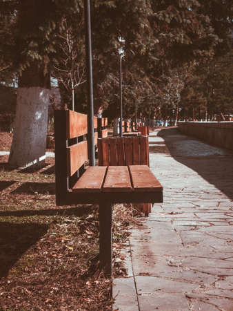 Wooden bench in the park. Horizontal shot. Selective focus.