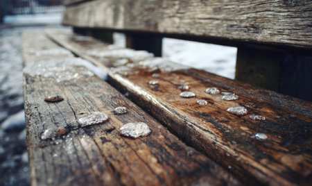 A detailed view of a weathered wooden bench in a foggy, atmospheric setting, with cold tones highlighting the scene's solitude.