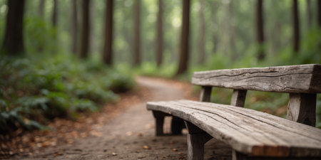 AI Generated. old wood and stone bench mockup forest background platform