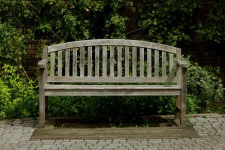 An old wooden bench stands against the background of green plants in the garden