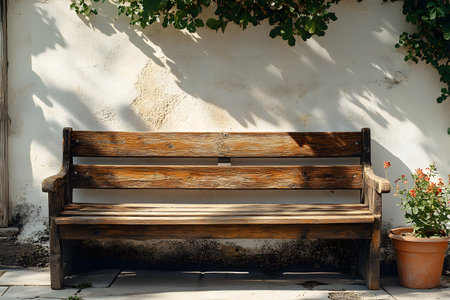 A rustic wooden bench rests against a sunlit wall, casting soft shadows. above, lush greenery adds texture, while a pot of red flowers sits nearby, creating a serene and inviting outdoor setting. Generative AI