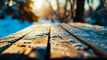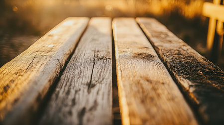 Modern wooden bench with deep texture close up at sunset warm light