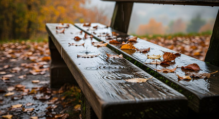 A wooden park bench sits empty in the rain, covered with wet, fallen autumn leaves. The scene captures a moody and melancholic atmosphere typical of a rainy fall day.
