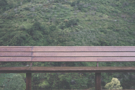 wood bench with mountain view in morning. hill on rainy day.